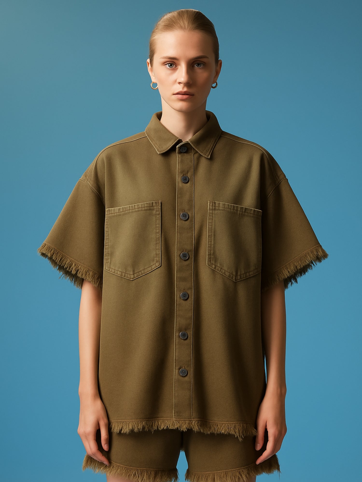 The garment showcases two oversized patch pockets at the chest, balanced with raw-edged sleeves and hemline for a deliberate deconstructed elegance. Its soft, sand-washed fade creates a tactile, almost vintage patina that speaks to considered craftsmanship and enduring style.