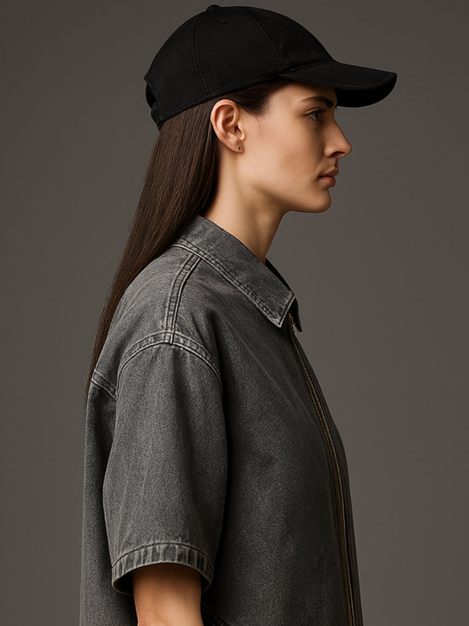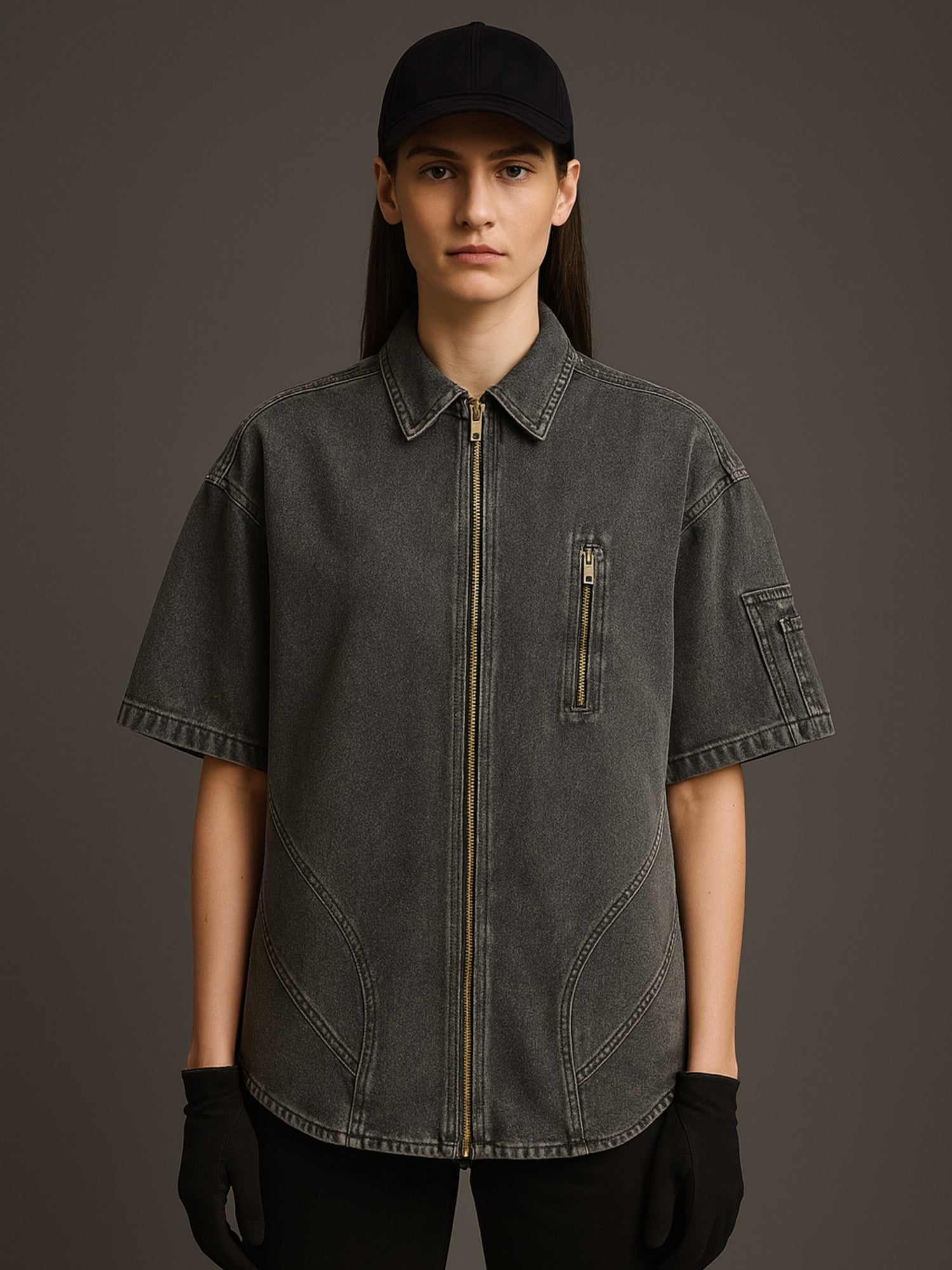 A utility-driven oversized shirt with clean lines and a lived-in wash. Built in a sturdy cotton denim this short-sleeve layer balances sharp tailoring with workwear practicality. Wear it zipped as a shirt or open as a light jacket.